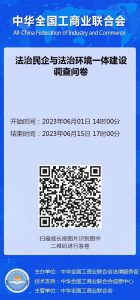由中华全国工商业联合会法律服务部主办的法治民企与法治环境一体建设调查正在填报中,请各会员单位积极响应,扫码填报。活动时间:6月1日至6月15日。感谢大家的大力支持!